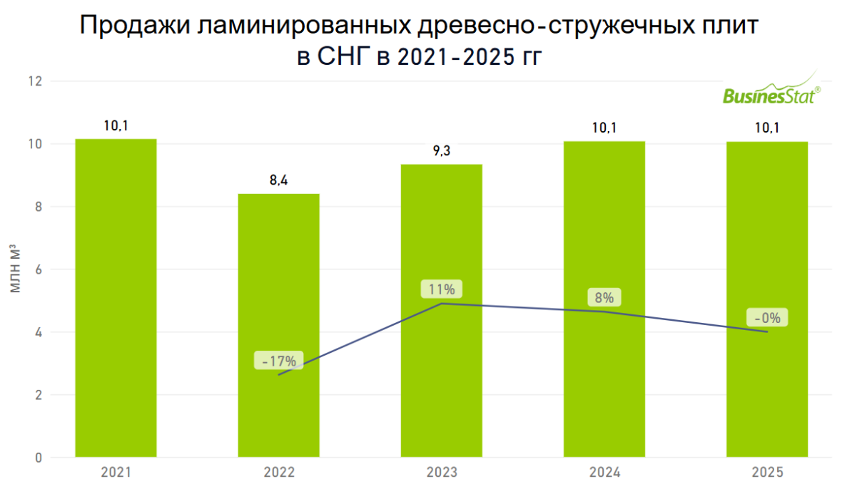 По данным «Анализа рынка ламинированных древесно-стружечных плит в странах СНГ», подготовленного BusinesStat в 2026 г, в 2021-2025 гг продажи ЛДСП в странах региона колебались от 8,4 до 10 млн м³ в год. Россия сохраняет статус лидера региона, обеспечивая порядка 60% всех внутренних продаж СНГ.