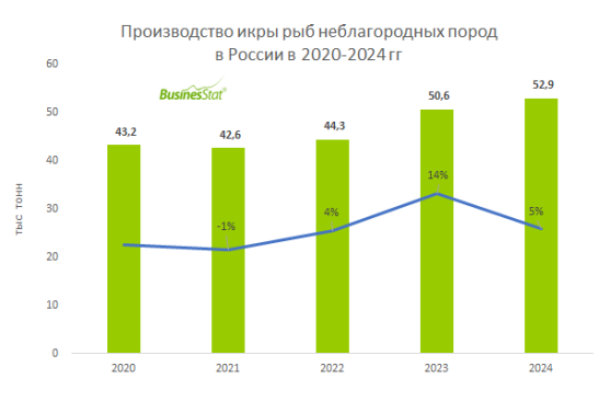 В 2020-2024 гг производство икры рыб неблагородных пород в России увеличилось на 22%: с 43 до 53 тыс т.