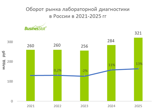 По данным «Анализа рынка лабораторной диагностики в России», подготовленного BusinesStat в 2026 г, в 2025 г оборот рынка лабораторной диагностики в стране увеличился на 13% до 321 млрд руб.