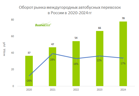 По данным «Анализа рынка междугородных автобусных перевозок в России», подготовленного BusinesStat в 2025 г, в 2020-2024 гг оборот рынка междугородных автобусных перевозок в стране вырос в 2 раза: с 37 до 78 млрд руб. Рост рынка обеспечивался увеличением численности междугородных поездок на 29% и повышением средней цены поездок на 65%.