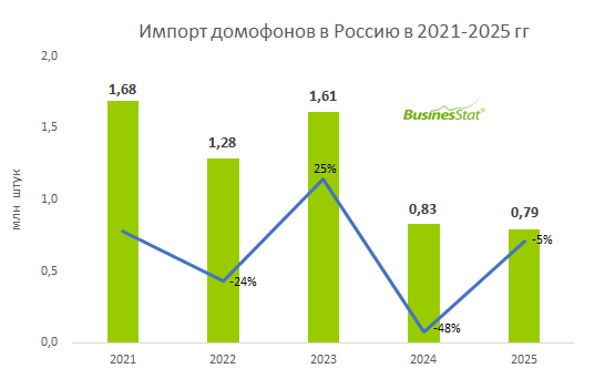 По данным «Анализа рынка домофонов в России», подготовленного BusinesStat, в 2024-2025 их импорт в страну снизился на 51% до 0,79 млн шт.