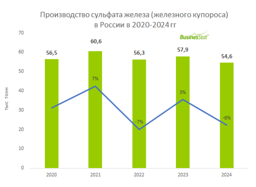 По данным «Анализа рынка сульфата железа (железного купороса) в России», подготовленного BusinesStat в 2025 г, в 2024 г его производство в стране сократилось на 6% и составило 55 тыс т. Железный купорос является побочным продуктом металлообрабатывающих заводов, его выпуск зависит от производства стали.