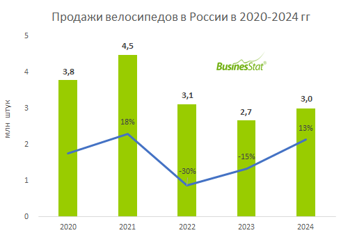 По данным исследования "Анализ рынка велосипедов в России", подготовленного BusinesStat в 2025 г, в 2024 г их продажи в стране выросли на 13% до 3 млн штук. Рынок начал восстанавливаться после значительного снижения продаж в 2022-2023 гг.