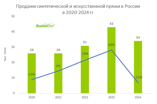 По данным «Анализа рынка синтетической и искусственной пряжи в России», подготовленного BusinesStat в 2025 г, ее продажи в стране в 2024 г упали на 21% и составили 34 тыс т.