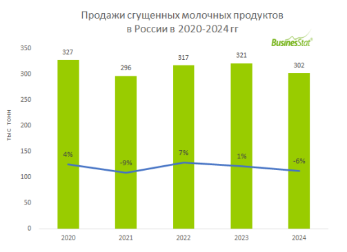 По данным «Анализа рынка сгущенных молочных продуктов в России», подготовленного BusinesStat в 2025 г, в 2020-2024 гг их продажи в стране снизились на 8%: с 327 до 302 тыс т.