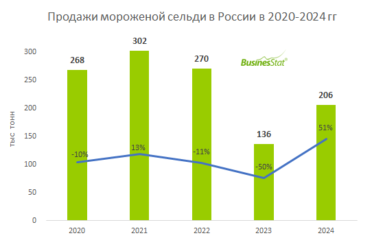 В 2024 г продажи мороженой сельди в России увеличились на 51%: с 136 до 206 тыс т.