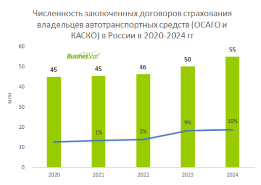 По данным «Анализа рынка страхования владельцев автотранспортных средств (ОСАГО и КАСКО) в России», подготовленного BusinesStat в 2025 г, численность заключенных договоров ОСАГО и КАСКО в стране в 2024 г выросла на 10%: с 50 до 55 млн.