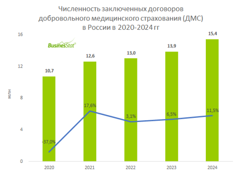 По данным «Анализа рынка добровольного медицинского страхования (ДМС) в России», подготовленного BusinesStat в 2025 г, в 2024 г численность заключенных договоров ДМС в стране увеличилась на 12% и составила 15,4 млн ед.