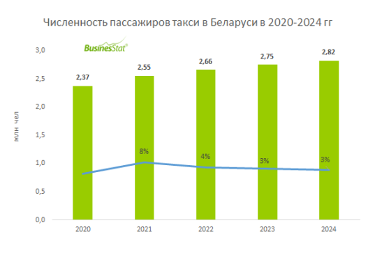 По данным «Анализа рынка услуг такси в Беларуси», подготовленного BusinesStat в 2025 г, за 2020-2024 гг в стране численность пассажиров такси увеличилась с 2,4 до 2,8 млн чел. Основными потребителями услуг такси являются городские жители и туристы. Рост городского населения, а также активное развитие въездного туризма благоприятно отразилось на показателях рынка такси. Доступность услуг такси повышается по мере улучшения качества интернета и развития мобильных приложений для заказа такси.
