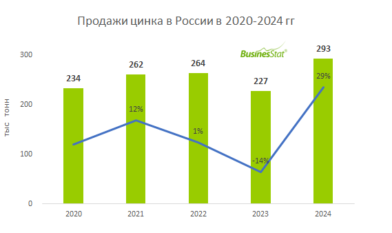 Продажи цинка на внутреннем рынке в России в 2024 г выросли на 29% до 293 тыс т.