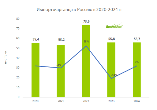 По данным «Анализа рынка марганца в России», подготовленного BusinesStat в 2025 г, в 2020-2024 гг его импорт в страну увеличился на 0,6%: с 55,4 до 55,7 тыс т.