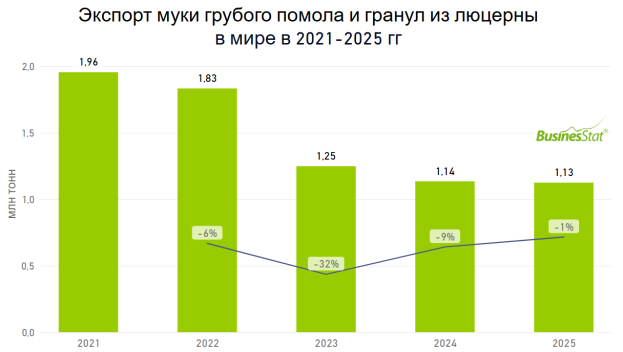 В 2021-2025 гг мировой экспорт муки грубого помола и гранул из люцерны сократился с 1,96 до 1,13 млн тонн.