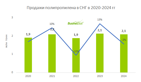 За 2020-2024 гг продажи полипропилена в странах СНГ увеличились на 10% до 2,1 млн т.