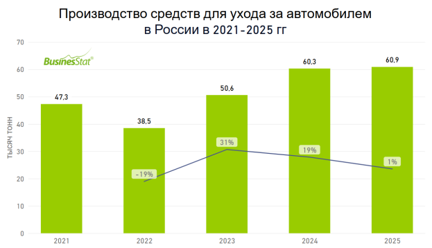 По данным «Анализа рынка средств для ухода за автомобилем (автокосметики) в России», подготовленного BusinesStat в 2026 г, их производство за 2021-2025 гг выросло на 29% – с 47,3 до 60,9 тыс т.
