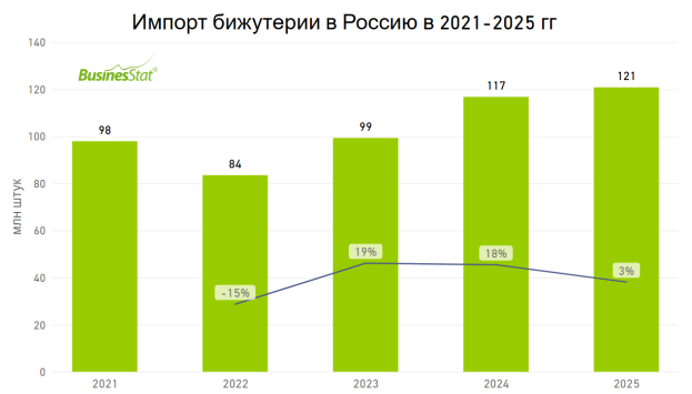 За 2021-2025 гг импорт бижутерии в Россию вырос на 23% с 98 до 121 млн штук.