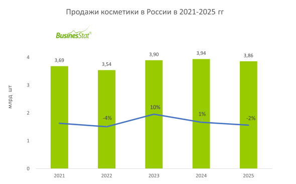 По данным «Анализа рынка косметики в России», подготовленного BusinesStat в 2026 г, в 2025 г ее продажи в стране снизились на 2% до 3,9 млрд шт. Спад вызван снижением реализации косметики в традиционной офлайн-торговле.