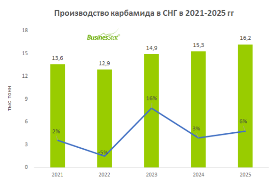 По данным «Анализа рынка карбамида (мочевины) в странах СНГ», подготовленного BusinesStat, его производство в странах СНГ в 2021-2025 гг увеличилось на 19% и достигло 16 млн т.