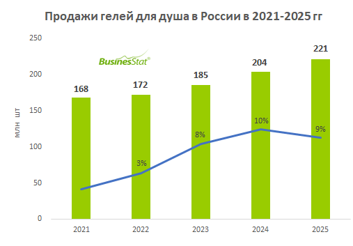 По данным «Анализа рынка гелей для душа в России», подготовленного BusinesStat в 2026 г, за 2021-2025 гг их продажи в стране увеличились на 32%: с 168 до 221 млн шт.