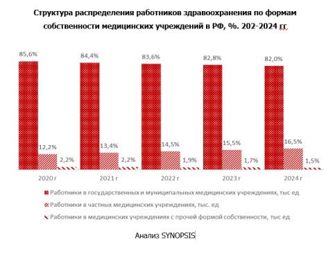 Доля работников государственных и муниципальных медицинских учреждений сократилась с 85,6% в 2020 г до 82% в 2024 г.