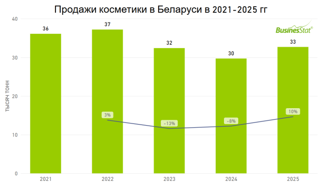 По данным «Анализа рынка косметики в Беларуси», подготовленного BusinesStat в 2026 г, в 2025 г ее продажи в стране выросли на 10%: с 30 до 33 тыс т.