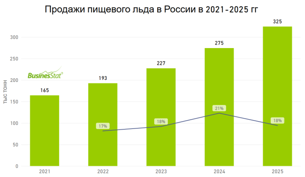 В 2021-2025 гг продажи пищевого льда в стране выросли почти вдвое: со 165 до 325 тыс тонн.