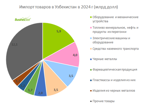 По данным «Анализа рынка товарооборота (экспорта и импорта) Узбекистана по двузначным кодам ТНВЭД», подготовленного BusinesStat в 2025 г, в 2024 г стоимость всех ввезенных товаров в Узбекистан составила 34,9 млрд долл. В структуре импорта преобладали: оборудование и механические устройства (17% поставок, или 5,9 млрд долл), топливо (11% импорта, или 4 млрд долл), электрические машины и оборудование (10% поставок, или 3,5 млрд долл), такой же объем заняли транспортные средства.
