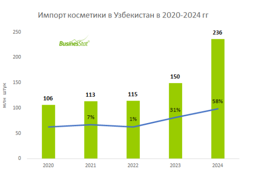 По данным «Анализа рынка косметики в Узбекистане», подготовленного BusinesStat в 2025 г, за 2023-2024 гг ее импорт в страну вырос в 2 раза и достиг 236 млн шт. Рост численности населения и развитие культуры потребления косметики способствуют наращиванию импорта.