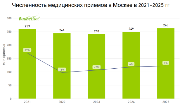 В 2025 г объем медицинского рынка Москвы составил 263 млн приемов, превысив значение 2021 г лишь на 1,5%.