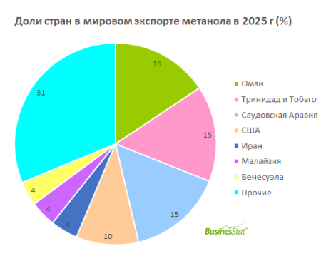 По данным «Анализа мирового рынка метанола», подготовленного BusinesStat в 2026 г, в 2025 г совокупный объём мирового экспорта метанола составил 33 млн т. Более 45% этих поставок обеспечила тройка стран-лидеров. Крупнейшим экспортёром стал Оман (16% мирового объёма), чьи мощности, такие как завод компании Oman Methanol Company (OMC), контролируемой консорциумом Proman и Consolidated Energy, традиционно ориентированы на рынки Азии. Вслед за ним с минимальным отрывом расположились Тринидад и Тобаго (15%) и Саудовская Аравия (15%).