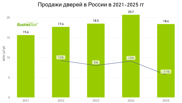 По данным «Анализа рынка дверей в России», подготовленного BusinesStat в 2026 г, в 2025 г их продажи на внутреннем рынке страны снизились на 11%: с 20,1 до 18,4 млн шт.