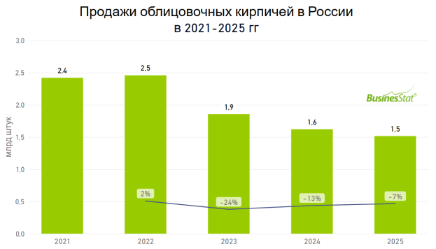 По данным «Анализа рынка облицовочных кирпичей в России», подготовленного BusinesStat в 2026 г, в 2025 г их продажи в стране сократились на 7%: с 1,6 до 1,5 млрд шт.